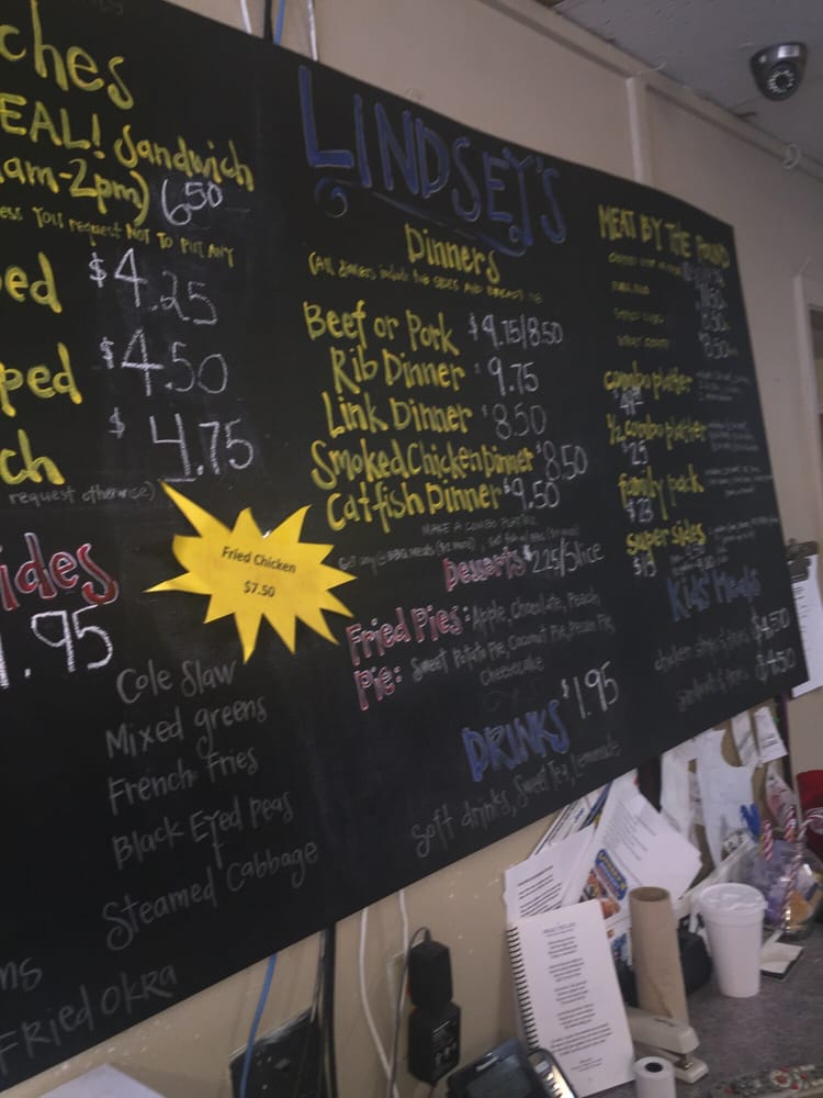 “ Today my sister, daughter and I decided to try Lindsey's. The food was amazing. My sister did a vegetable plate and loved the Cabbage, Greens and sweet potatoes. My daughter did the smoked chicken with macaroni and Cheese and black-eyed peas. I had the Catfish with macaroni and cheese and black-eyed peas. It was all wonderful and great down home cooking. We were greeted as we walked in and they live up to the hospitality in their name. Such a wonderful greeting only surpassed by the food. I really hope people see this review and give them a try. There is history, great food and people at Lindsey's. It is very worth a trip to eat and just enjoy a visit. ”